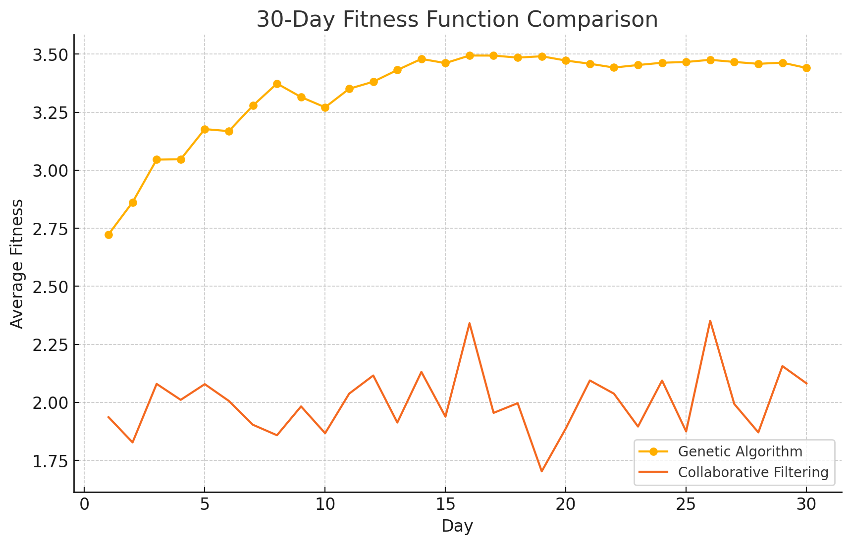 The plot showing the comparison of average fitness scores over a 30-day period for both the Genetic Algorithm (GA) based recommender and the Collaborative Filtering (CF) based recommender. As illustrated, the GA-based system shows a trend of improving fitness, indicating adaptation and optimization over time, whereas the CF-based system shows more variability with generally lower scores.