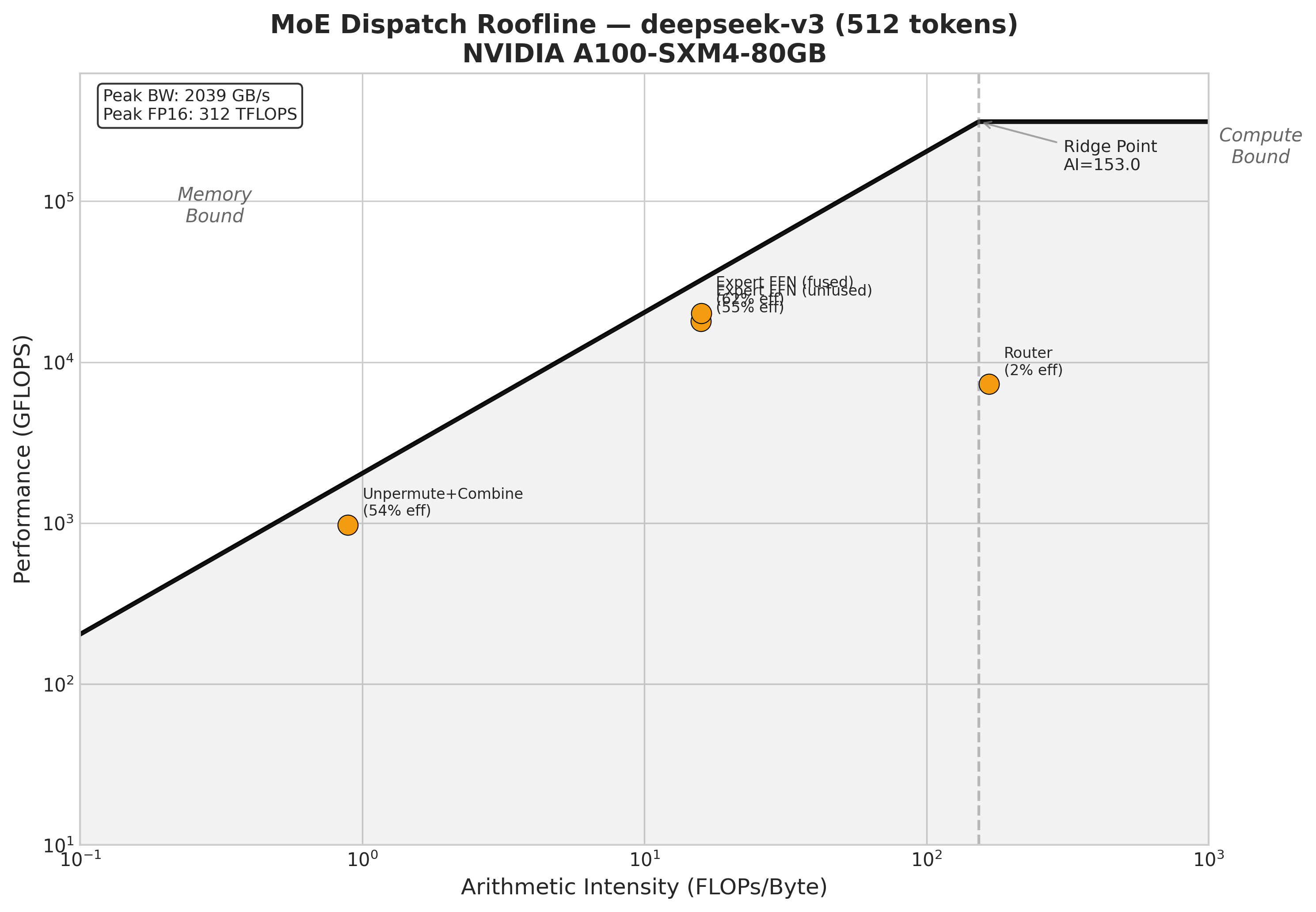 DeepSeek-V3 tells a different story. With 256 experts and tiny per-expert batches, even the expert FFN is memory-bound, sitting on the bandwidth slope, not the compute plateau. The unpermute kernel actually hits 54% of peak bandwidth, which is decent for an irregular scatter operation.